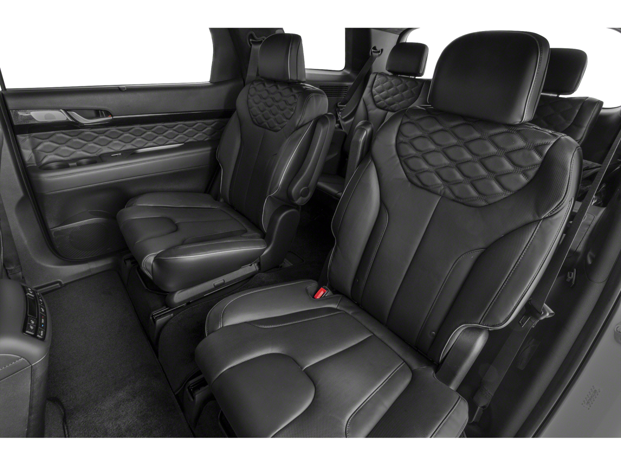 Option Group 01, 12 Speakers, 3.648 Axle Ratio, 3rd row seats: split-bench, 4-Wheel Disc Brakes, ABS brakes, Air Conditioning, Alloy wheels, AM/FM radio: SiriusXM, Apple CarPlay & Android Auto, Auto High-beam Headlights, Auto-dimming Rear-View mirror, Auto-leveling suspension, Automatic temperature control, Brake assist, Bumper Applique, Bumpers: body-color, Cargo Cover/Screen, Cargo Net, Carpeted Floor Mats, Compass, Delay-off headlights, Driver door bin, Driver vanity mirror, Dual front impact airbags, Dual front side impact airbags, Electronic Stability Control, Emergency communication system: Blue Link Connected Car Service (3-year complimentary subscription), Four wheel independent suspension, Front anti-roll bar, Front Bucket Seats, Front Center Armrest, Front dual zone A/C, Front reading lights, Fully automatic headlights, Garage door transmitter: HomeLink, harman/kardon® Speakers, Heads-Up Display, Heated & Ventilated Front Bucket Seats, Heated door mirrors, Heated front seats, Heated rear seats, Heated steering wheel, Illuminated entry, Knee airbag, Low tire pressure warning, Memory seat, Mudguards, Navigation System, Occupant sensing airbag, Outside temperature display, Overhead airbag, Overhead console, Panic alarm, Passenger door bin, Passenger vanity mirror, Power door mirrors, Power driver seat, Power Liftgate, Power moonroof, Power passenger seat, Power steering, Power windows, Premium Nappa Leather Seat Trim, Radio data system, Radio: AM/FM/MP3 Premium Audio System, Rain sensing wipers, Rear air conditioning, Rear anti-roll bar, Rear audio controls, Rear reading lights, Rear window defroster, Rear window wiper, Reclining 3rd row seat, Remote keyless entry, Security system, Speed control, Speed-sensing steering, Split folding rear seat, Spoiler, Steering wheel mounted audio controls, Tachometer, Telescoping steering wheel, Tilt steering wheel, Traction control, Trip computer, Turn signal indicator mirrors, Variably intermittent wipers, Ventilated front seats, Ventilated rear seats, Wheel Locks, and Wheels: 20 x 7.5J Calligraphy Exclusive Alloy.